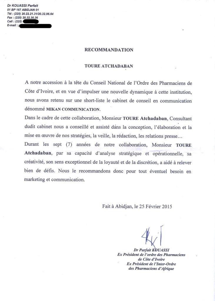 Monsieur Atchadaban TOURE, par sa capacité en analyse stratégique et opérationnelle, sa créativité, son sens exceptionnel de la loyauté et de la discrétion, nous a aidé à relever bien de défis.